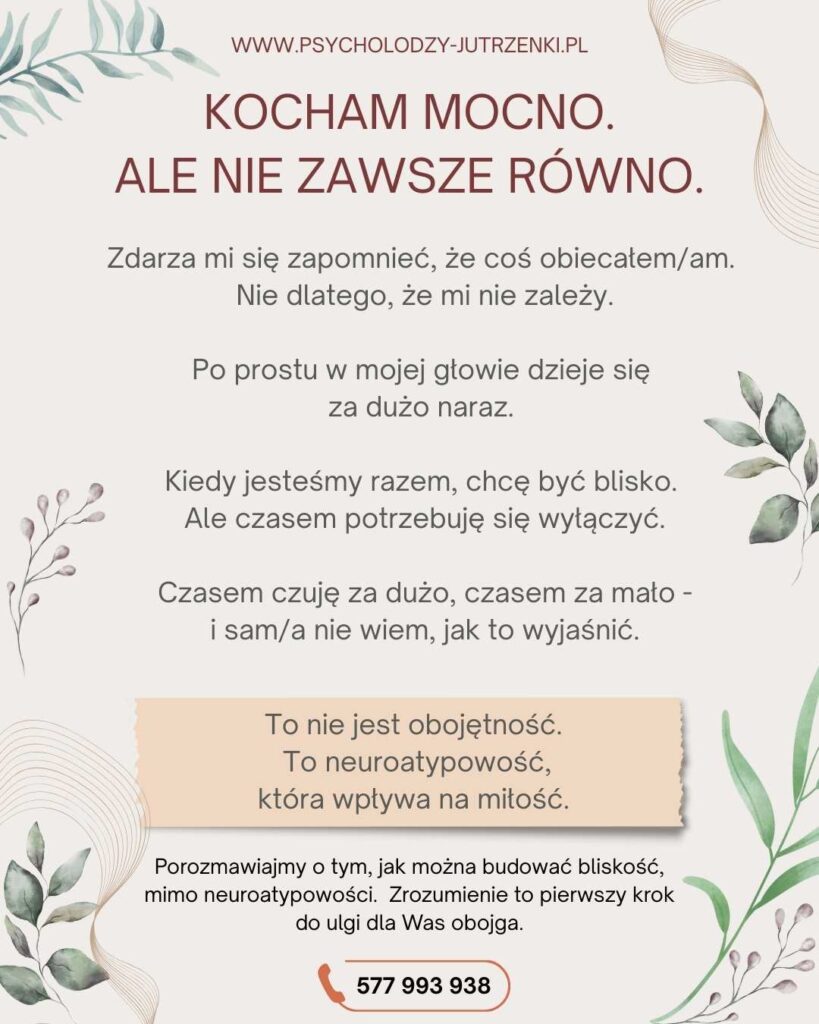 Bo miłość w kontekście ADHD nie musi być dramatem. Może być procesem dojrzewania do siebie i do drugiego. W Psycholodzy na Jutrzenki pomagamy przełożyć neuroatypowość na język codziennego życia – nie po to, by ją „naprawiać”, ale by zrozumieć i wspólnie unieść.